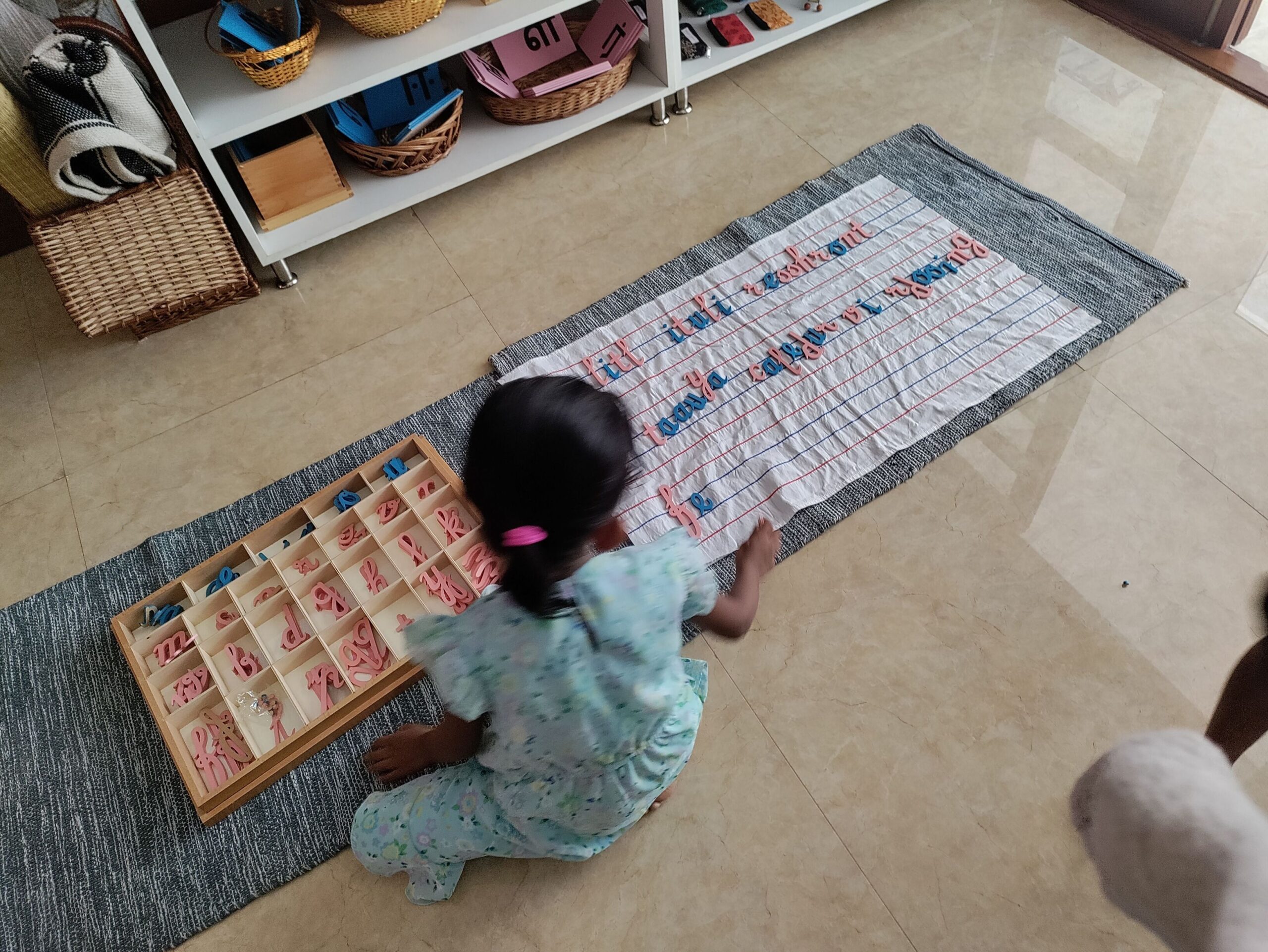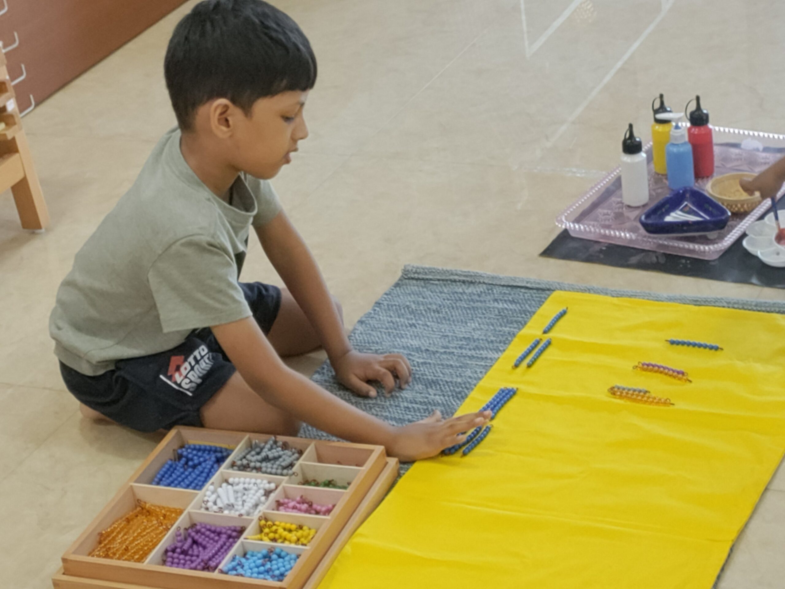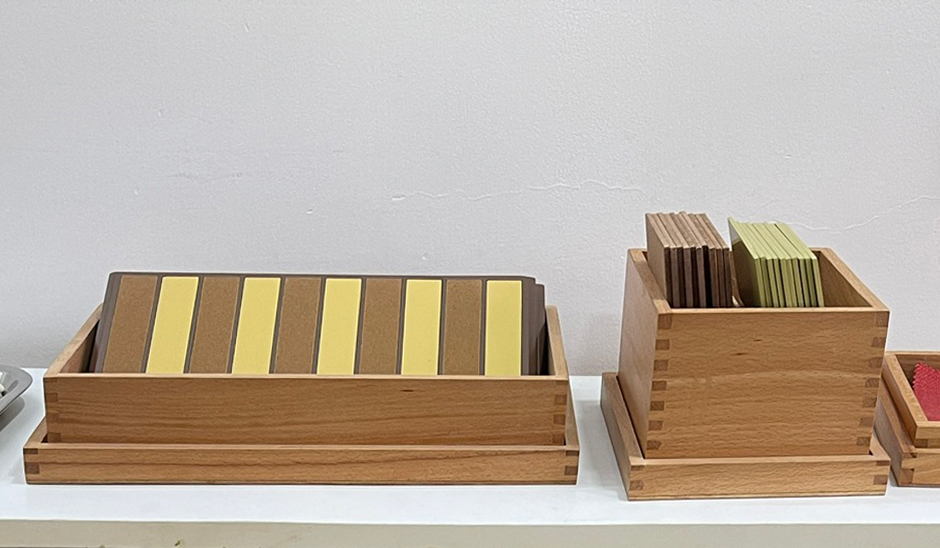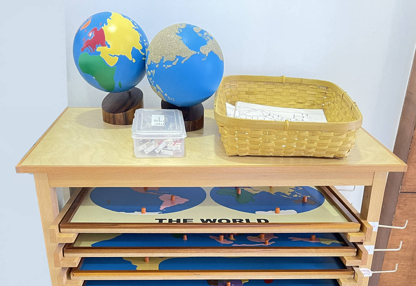 Specially designed learning materials are displayed on open shelves, easily accessible to the children. Classrooms also include low sinks, child-sized furniture, cozy spaces for quiet reading, reachable shelves with work available for free choice, and child-sized kitchen utensils so children can eat, prepare, and clean up their snacks on their own.