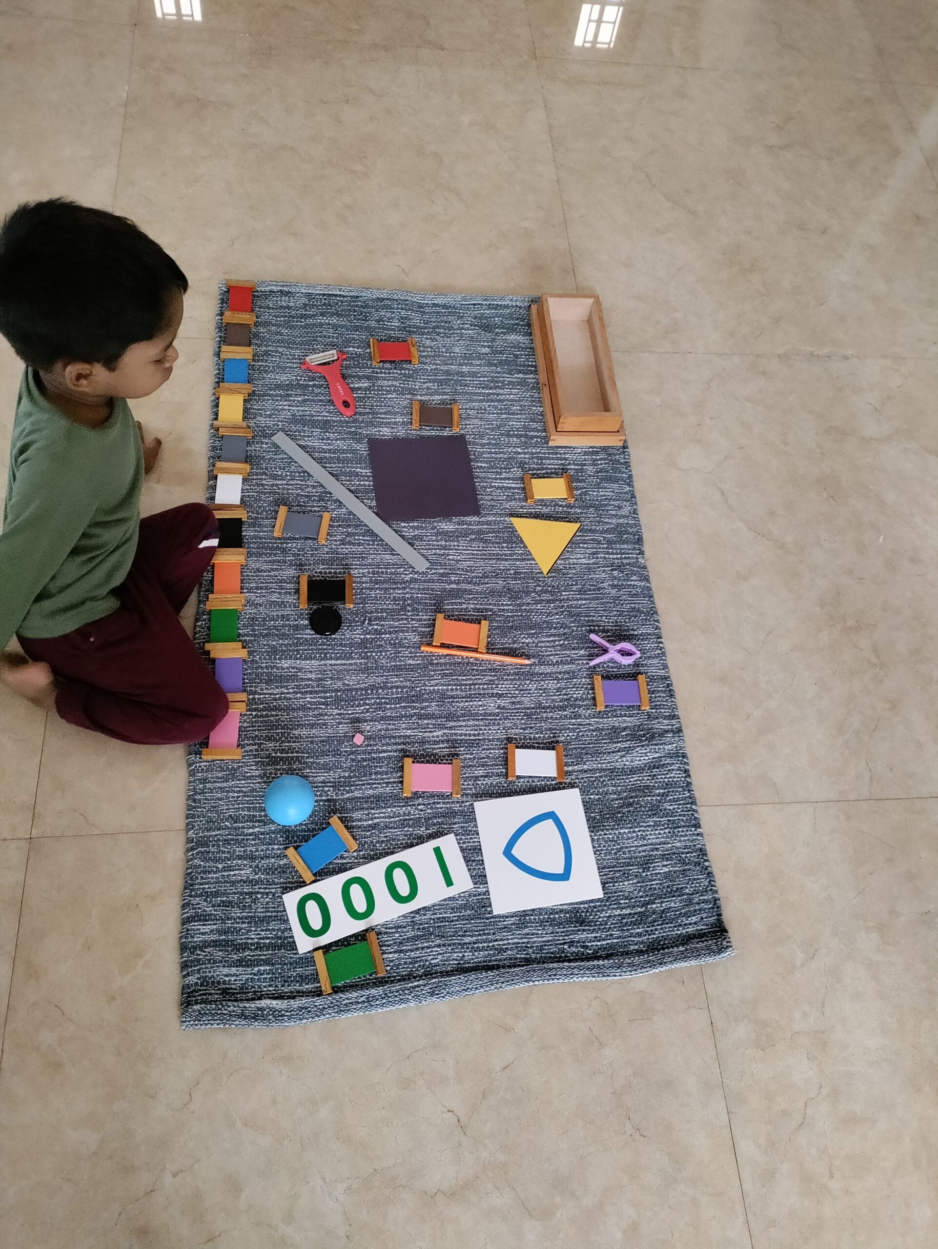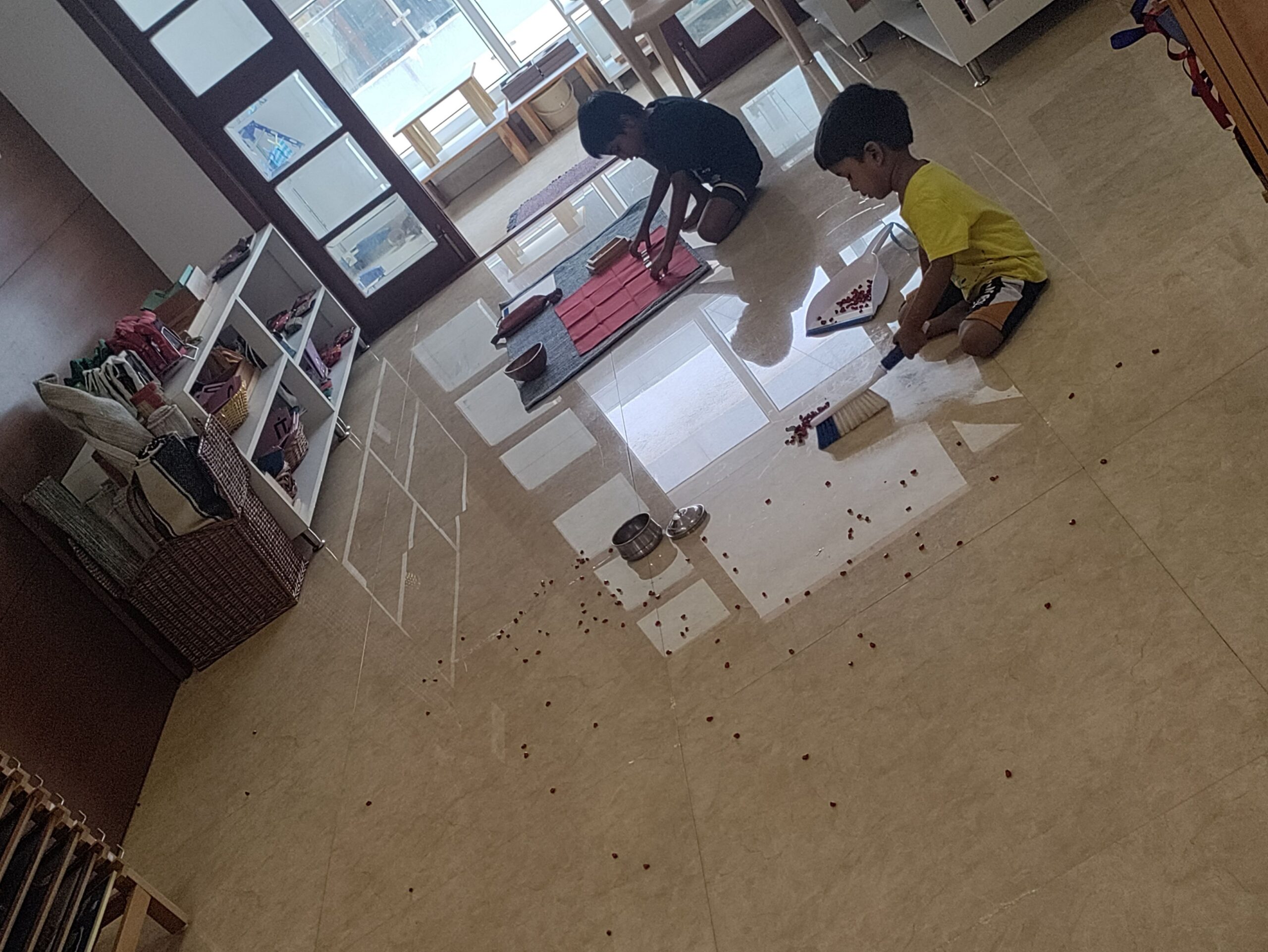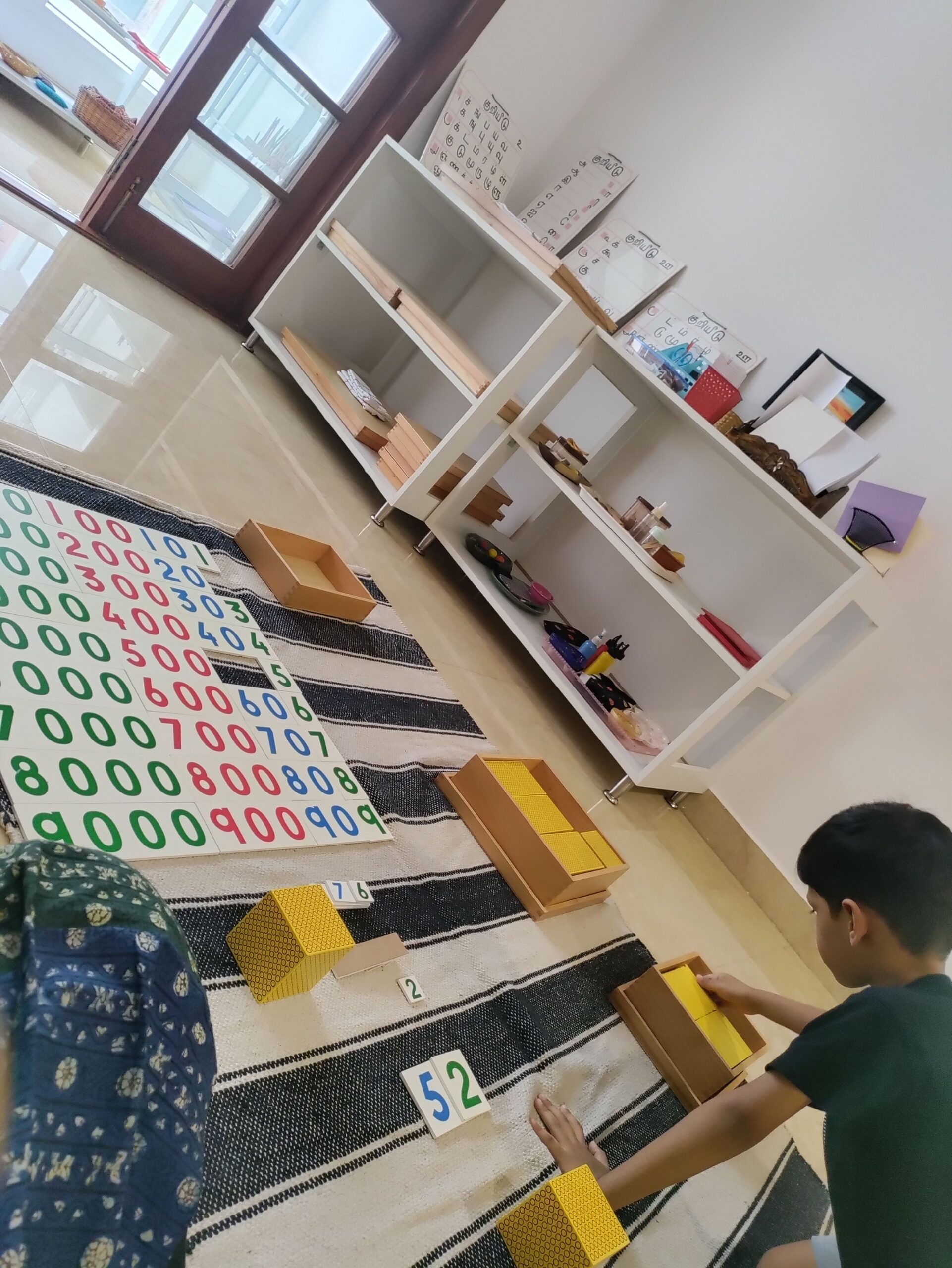 Specially designed learning materials are displayed on open shelves, easily accessible to the children. Classrooms also include low sinks, child-sized furniture, cozy spaces for quiet reading, reachable shelves with work available for free choice, and child-sized kitchen utensils so children can eat, prepare, and clean up their snacks on their own.